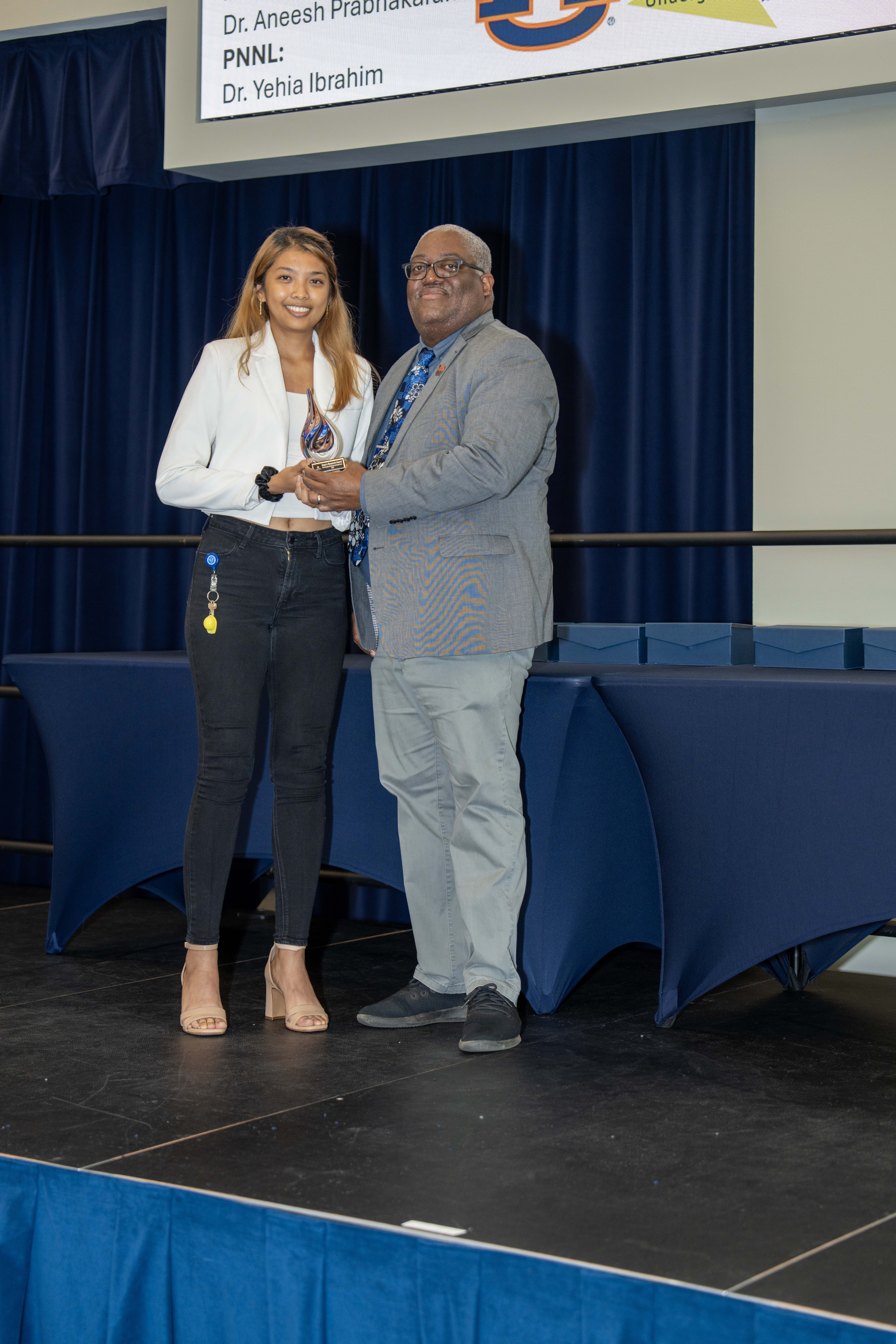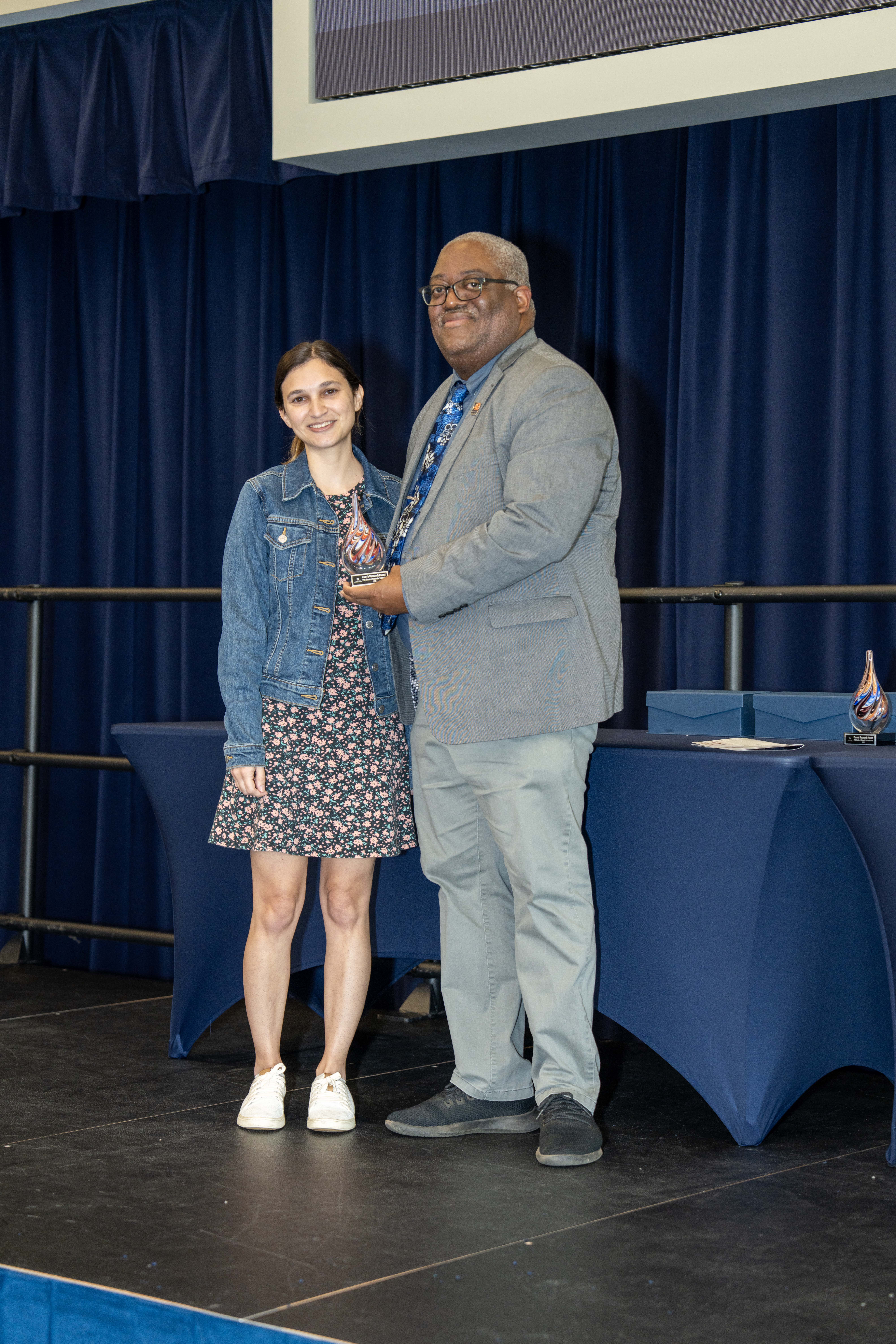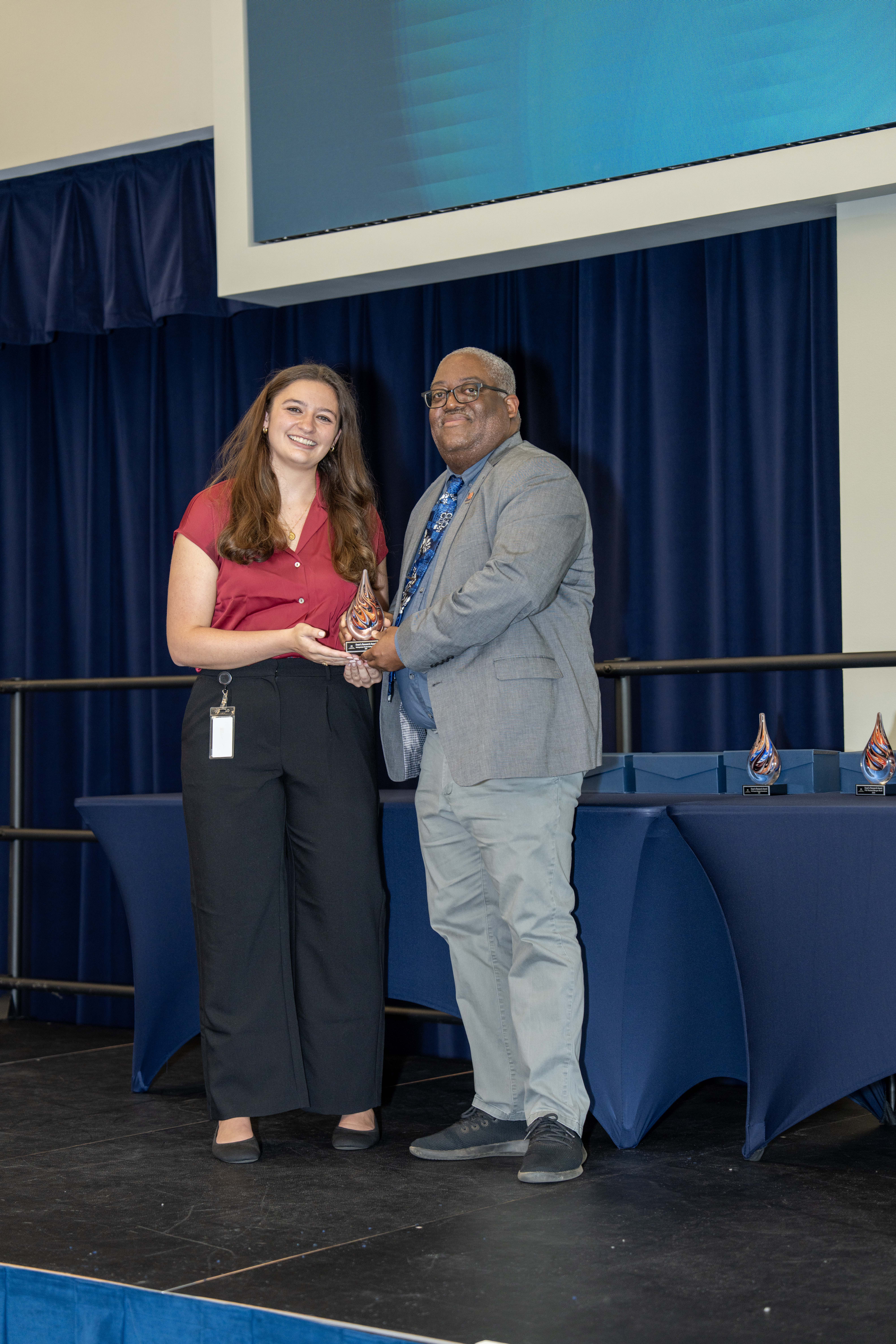 Undergraduate student Ashley DeSilva received the first Dean’s Research Award of the afternoon. “In the four years that I’ve been doing research, I worked on projects from NASA’s Europa mission to developing recombinant vaccines for agricultural pathogens,” DeSilva said. “These experiences shaped my path toward a PhD in immunology and vaccine development, and I’m grateful for the support I’ve received at Auburn.”