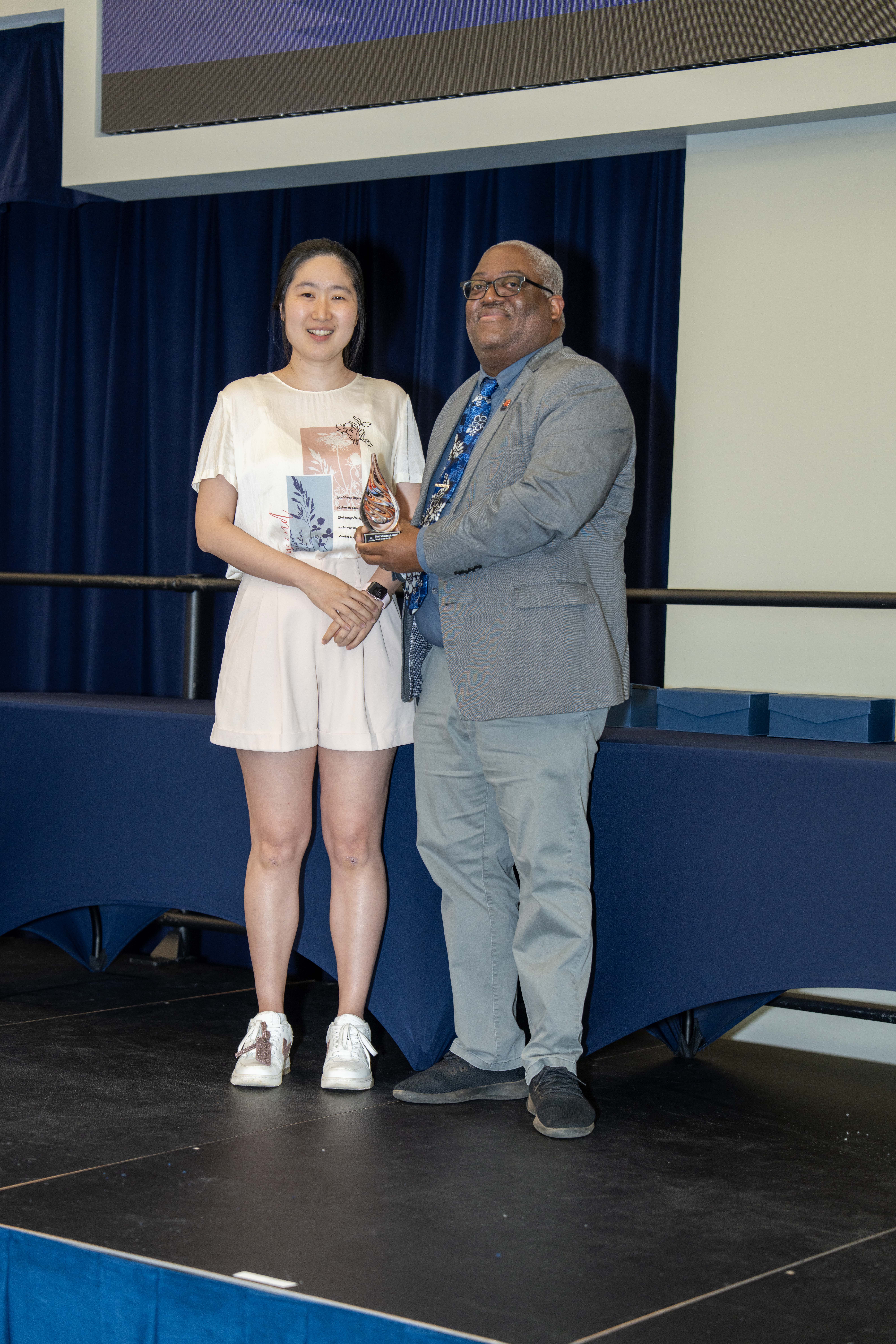 The faculty Dean’s Research Award went to Jingyi Zheng, associate professor in mathematics and statistics. “I focus on developing AI models that turn massive, complex data into knowledge,” Zheng said. “From brain connectivity to cardiac risk prediction and even detection dog training success, the goal is to make real-world impact across disciplines.”