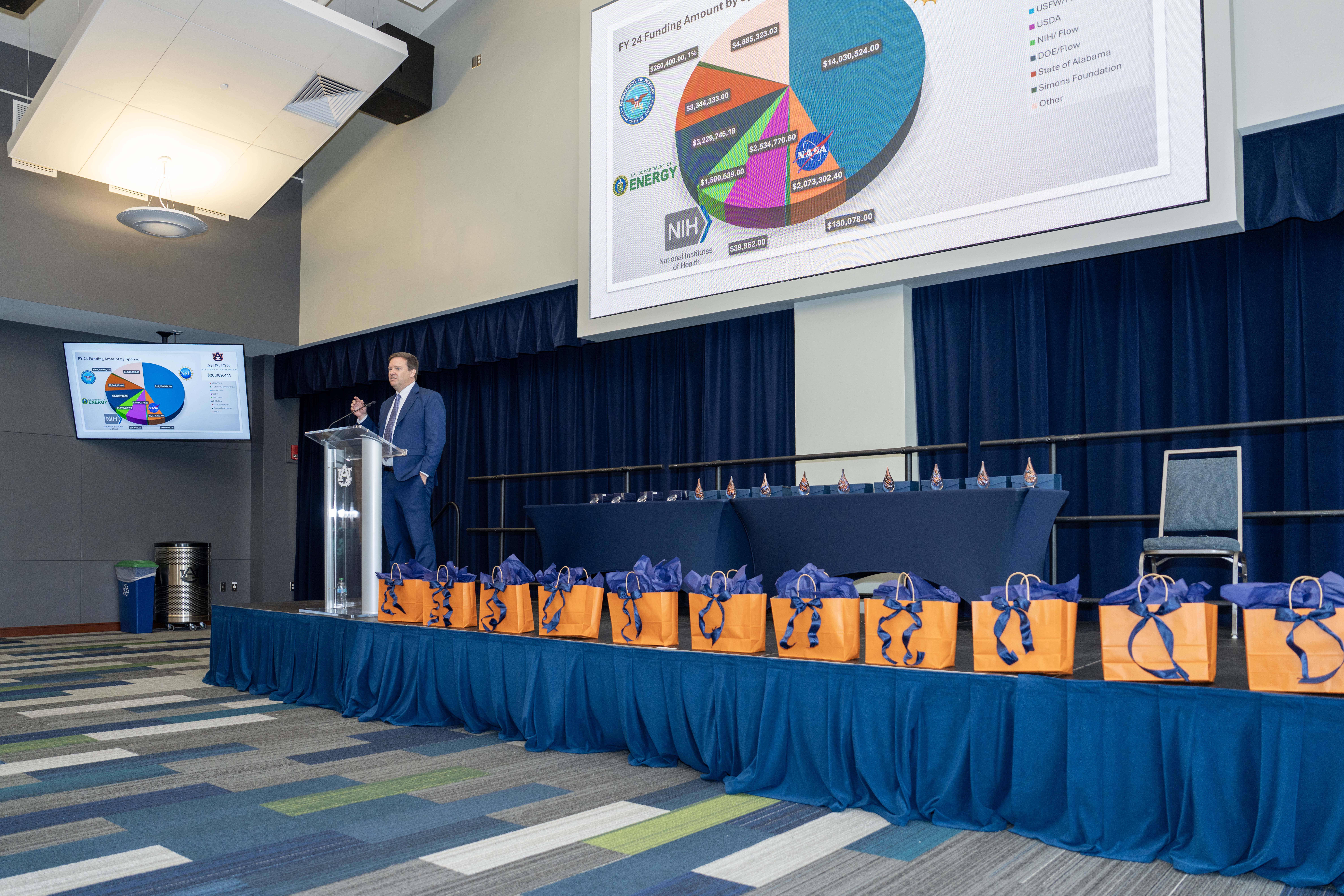 Mark Liles, associate dean for research, opened the ceremony by highlighting the teamwork that led to COSAM reaching over $27 million in funding this year, which is a new record for COSAM. “It really takes an entire ecosystem of researchers – PIs, graduate students, postdocs, staff and research administration – we all contribute to those numbers together,” Liles said.