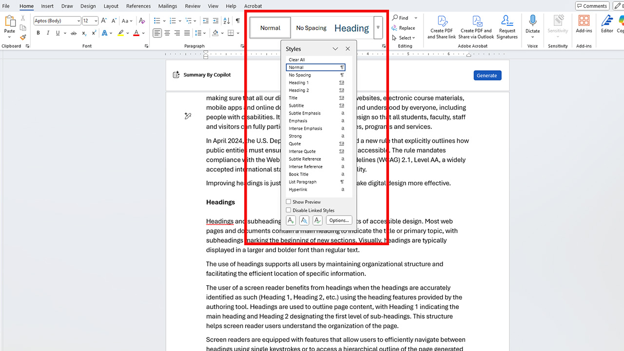 - In the Styles group, click the small arrow in the bottom-right corner to open the Styles pane.